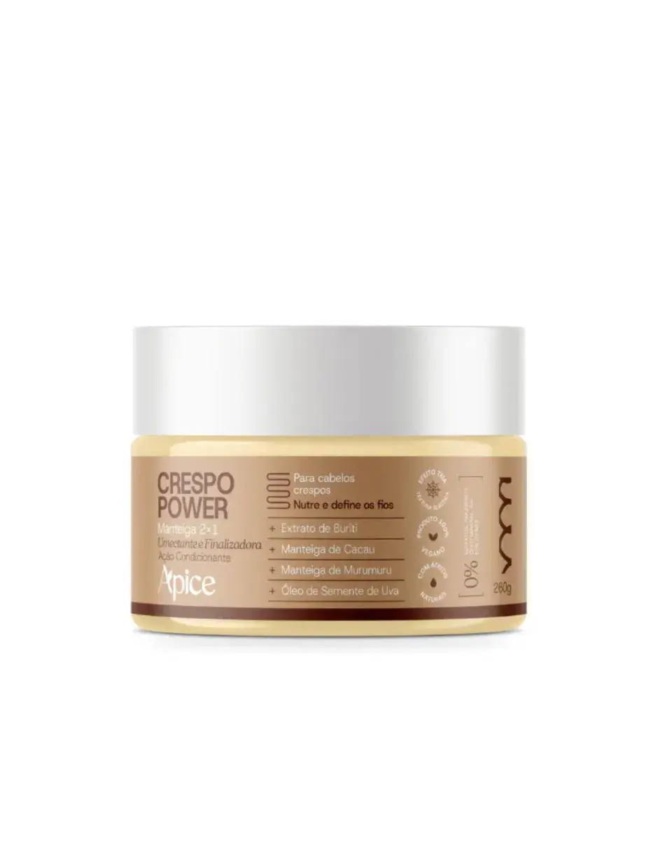Manteiga 2×1 Crespo Power é um tratamento capilar nutritivo e finalizador desenvolvido para cabelos crespos e porosos que precisam de nutrição profunda, fortalecimento, maciez e brilho intenso. Sua fórmula rica em manteigas e óleos vegetais promove reparação dos fios danificados, controla o frizz e modela os cachos com leveza, além de ser versátil para uso como tratamento, finalização ou umectação noturna.