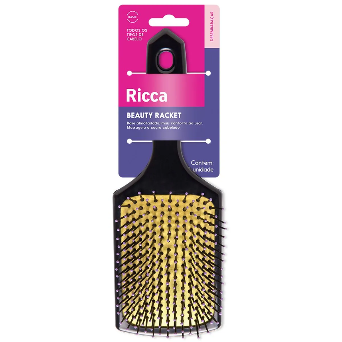 Escova de cabelo com base almofadada que proporcionam uma escovação muito mais confortável e cerdas com pontas protetoras que massageiam o couro cabeludo.